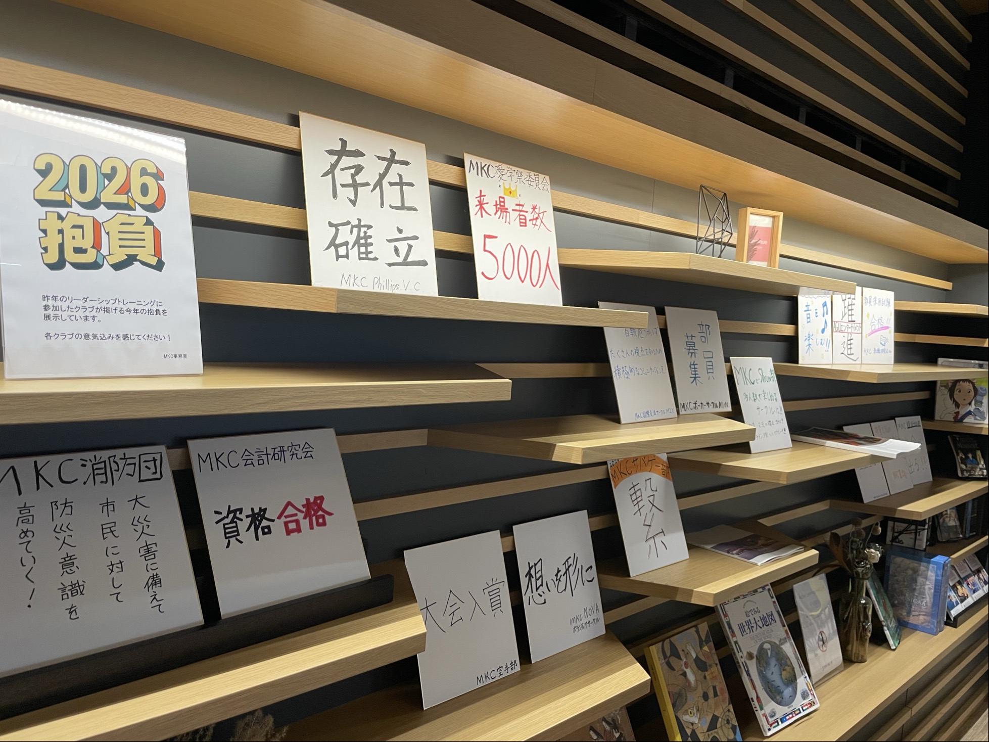 2026.4.10 クラブ アカデミック・コモンズにクラブサークルの今年の抱負を展示 アリスタワー1階のアカデミック・コモンズに、クラブサークルの今年度の抱負を展示しました。 昨年度、各クラブサークルの学生責任者対象のリーダーシップトレーニング研修に参加したクラブの学生責任者が書いた、2026年度の抱負です。